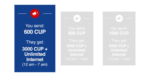 - What you get: top up 500 CUP or more and help your fam in Cuba enjoy 24-hour unlimited data for 10 full days.